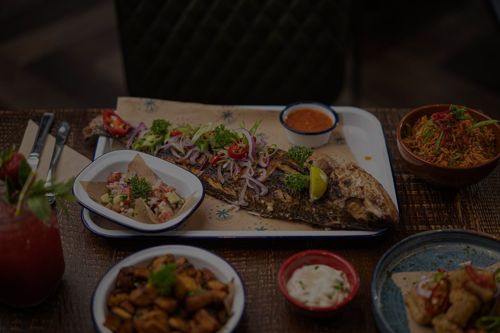 Charcoal-grilled whole catfish, marinated in bold African spices with pepper sauce and choice of side